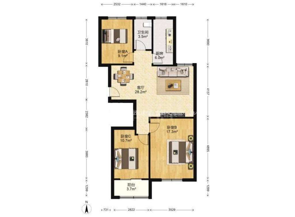 厅室3室2厅1卫1阳台