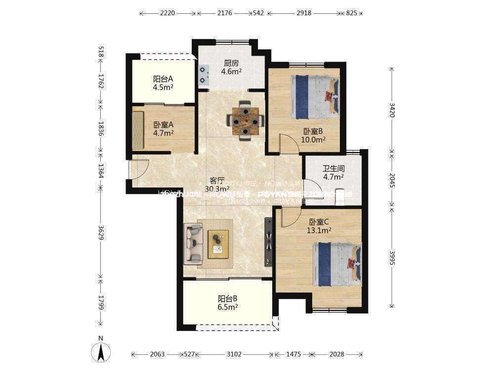 厅室3室2厅1卫1阳台