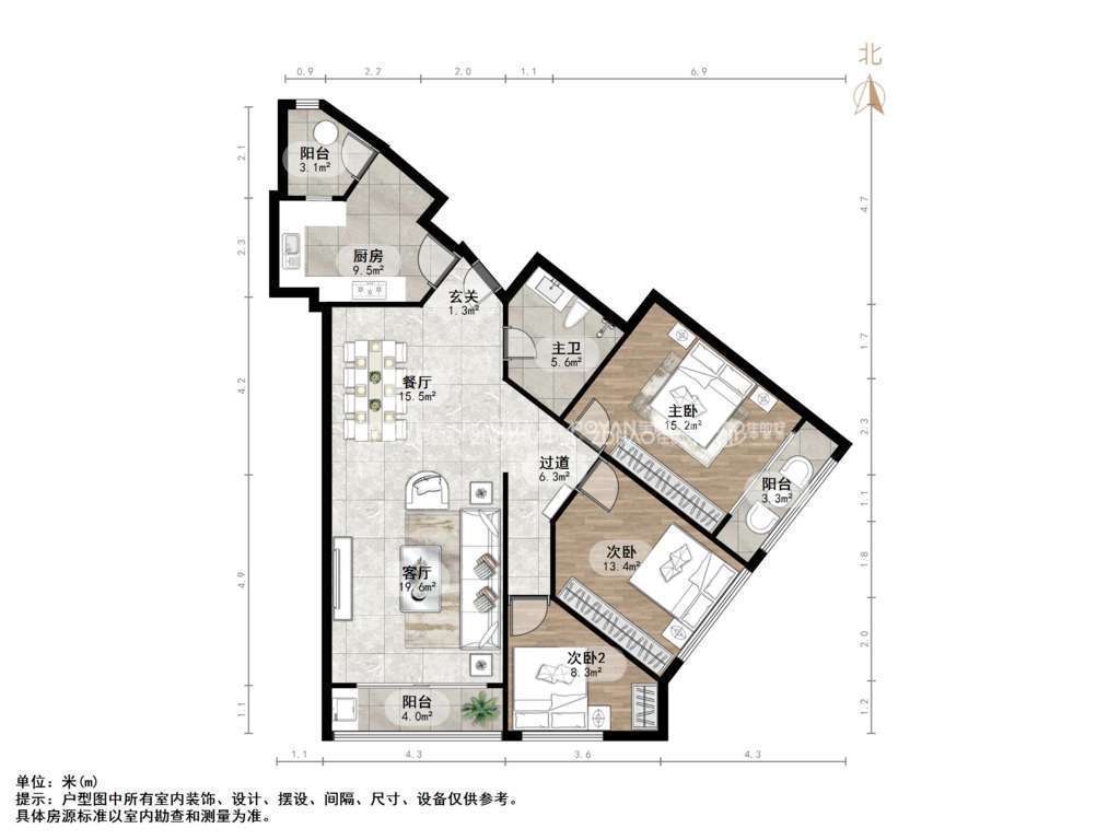 厅室3室2厅1卫1阳台