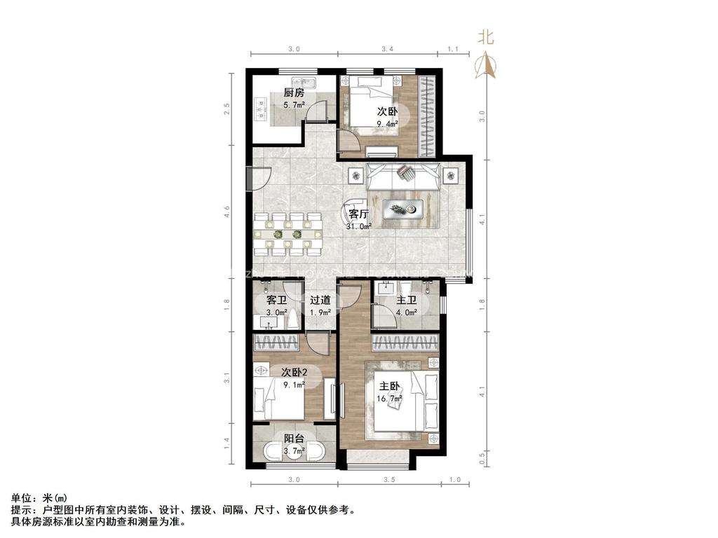 厅室3室2厅2卫1阳台