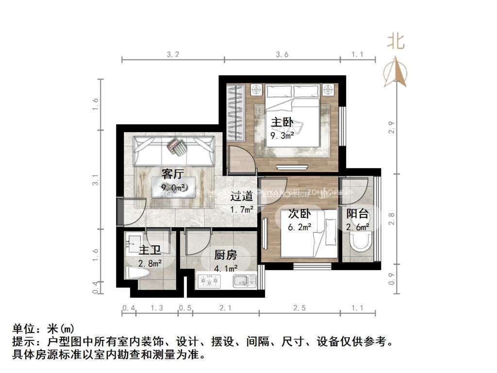 厅室2室1厅1卫1阳台