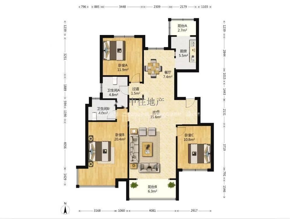 厅室3室2厅2卫1阳台