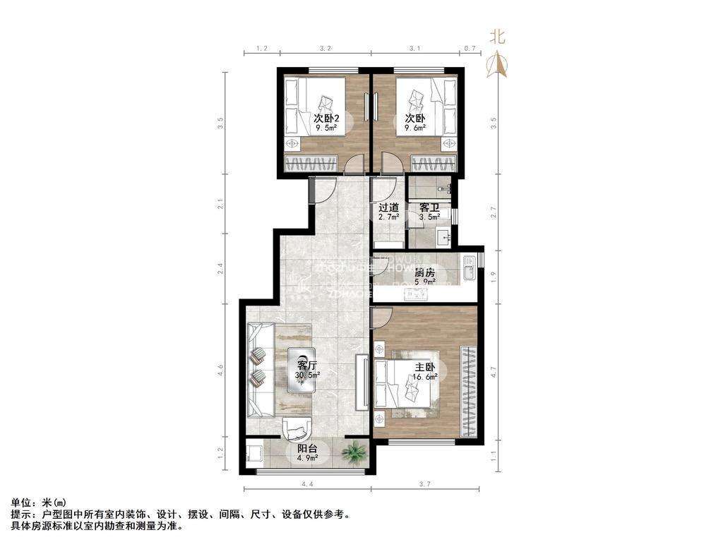 厅室3室2厅1卫1阳台