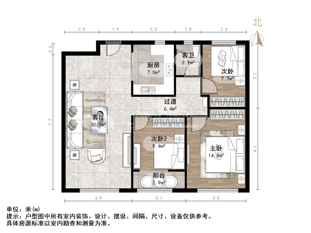 厅室3室2厅1卫1阳台