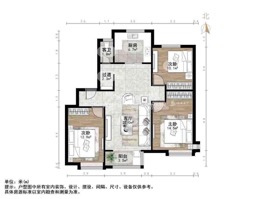 厅室3室2厅1卫1阳台