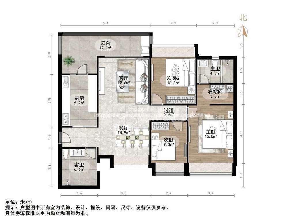 厅室3室2厅2卫1阳台