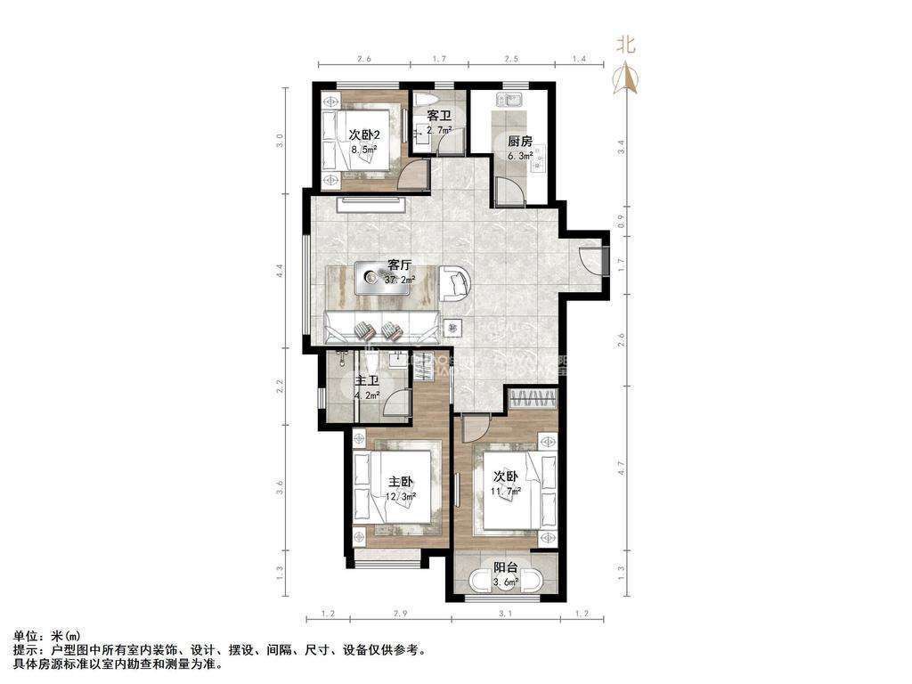 厅室3室2厅2卫1阳台