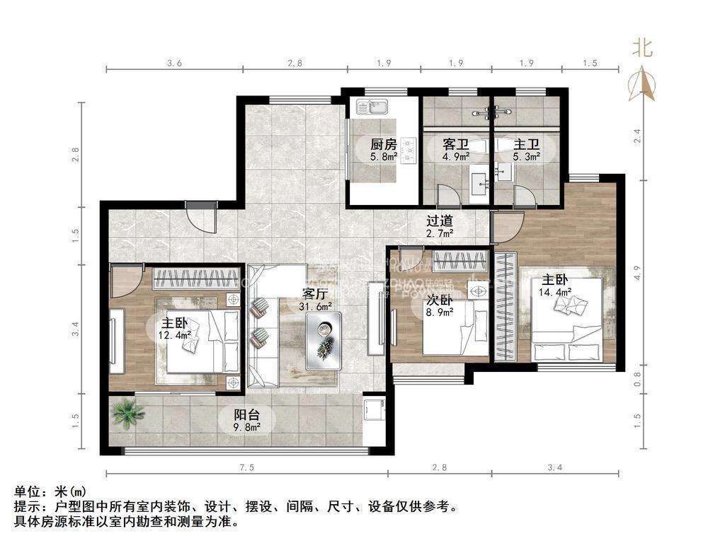 厅室3室2厅2卫1阳台