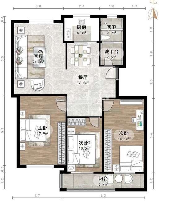 厅室3室2厅2卫1阳台