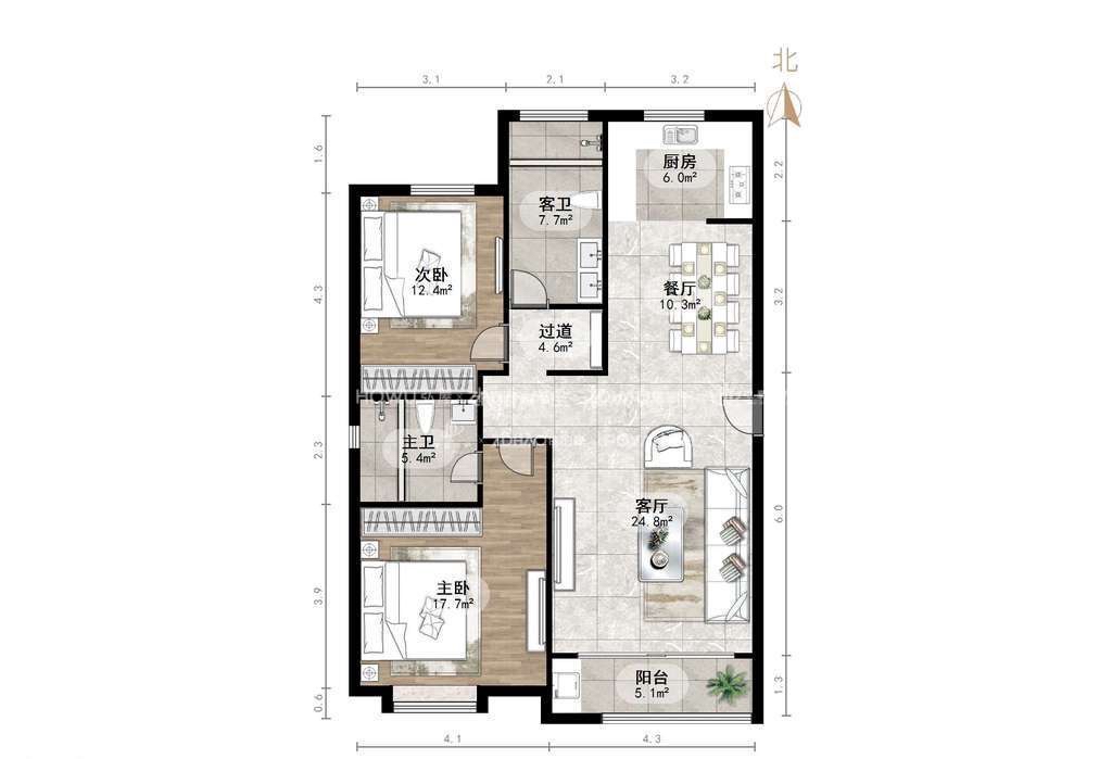 厅室3室2厅1卫1阳台