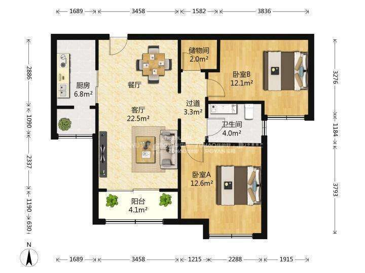 2、户型优势:两室两厅,南北卧室,客厅方正好用,单元对讲门,大院传达,安全性高!