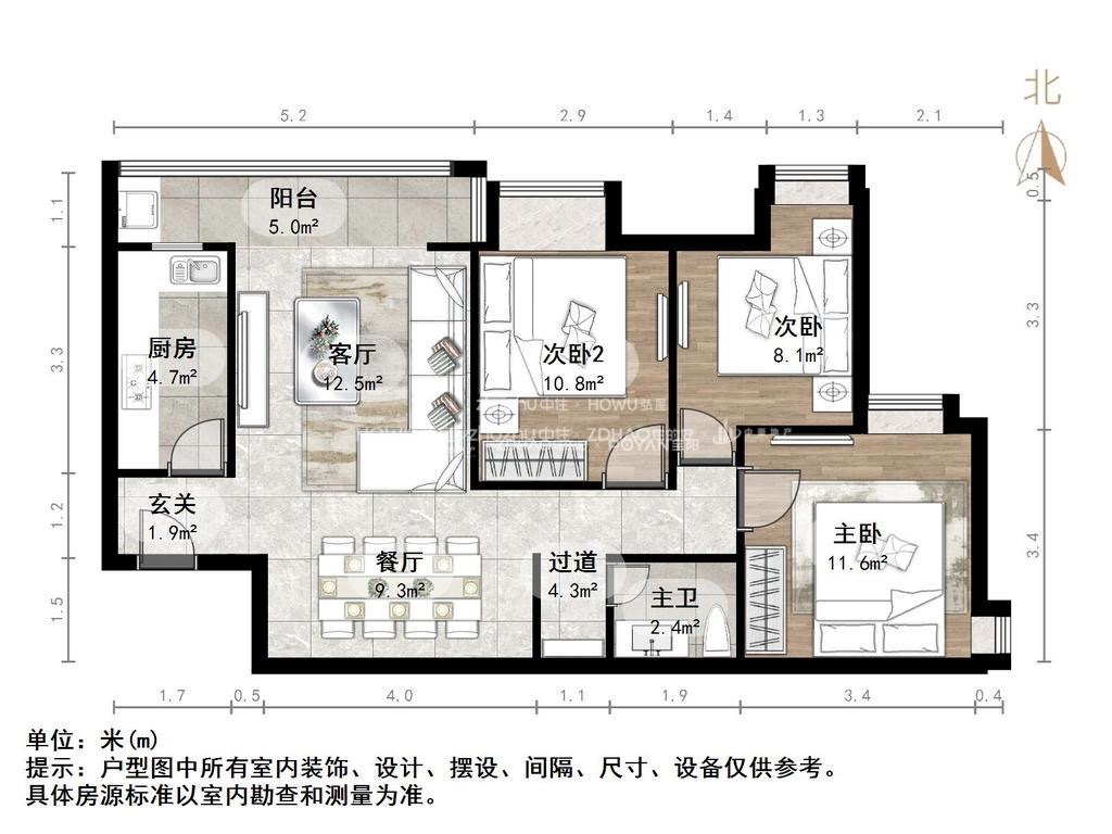 厅室3室2厅1卫1阳台