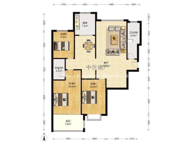 厅室3室2厅2卫1阳台