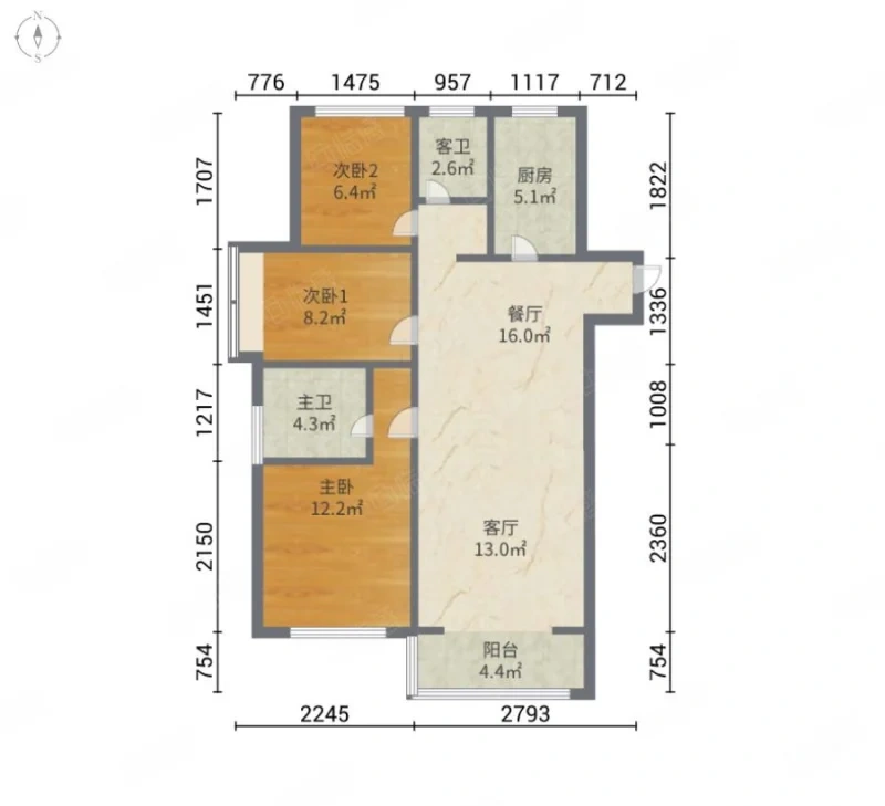 厅室3室2厅1卫1阳台
