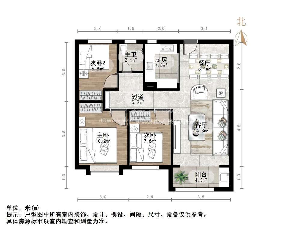 厅室3室2厅1卫1阳台