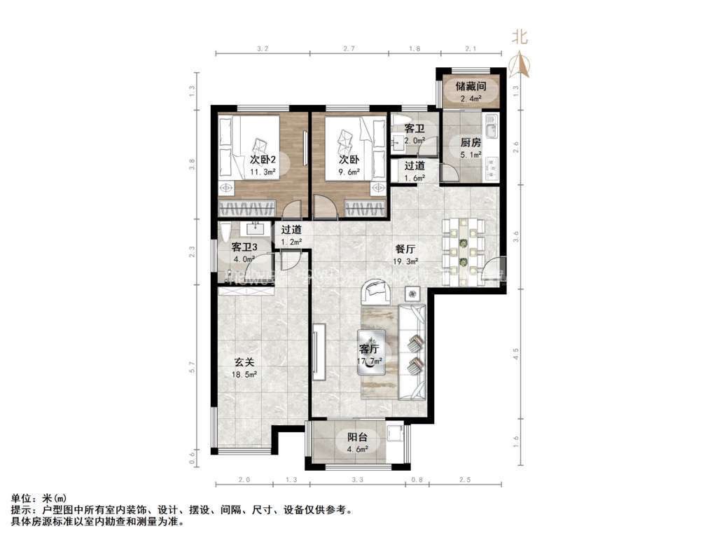 厅室3室2厅2卫1阳台