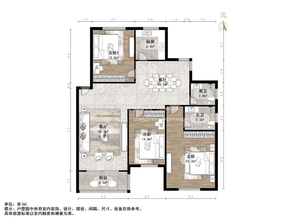厅室3室2厅2卫1阳台