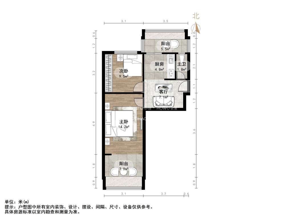厅室2室1厅1卫1阳台