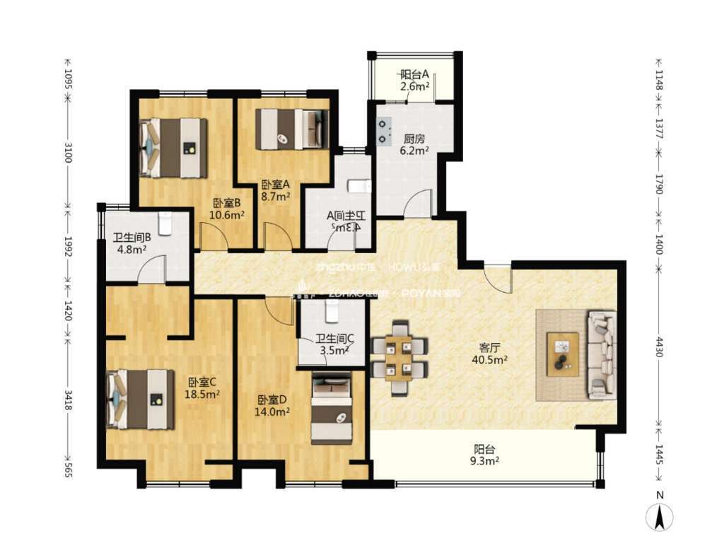 厅室4室2厅3卫2阳台