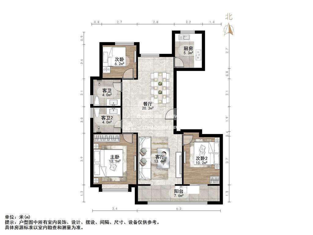 厅室3室2厅2卫1阳台