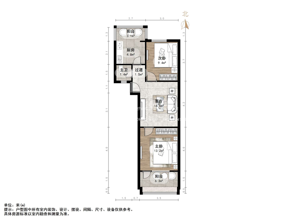 厅室2室1厅1卫2阳台