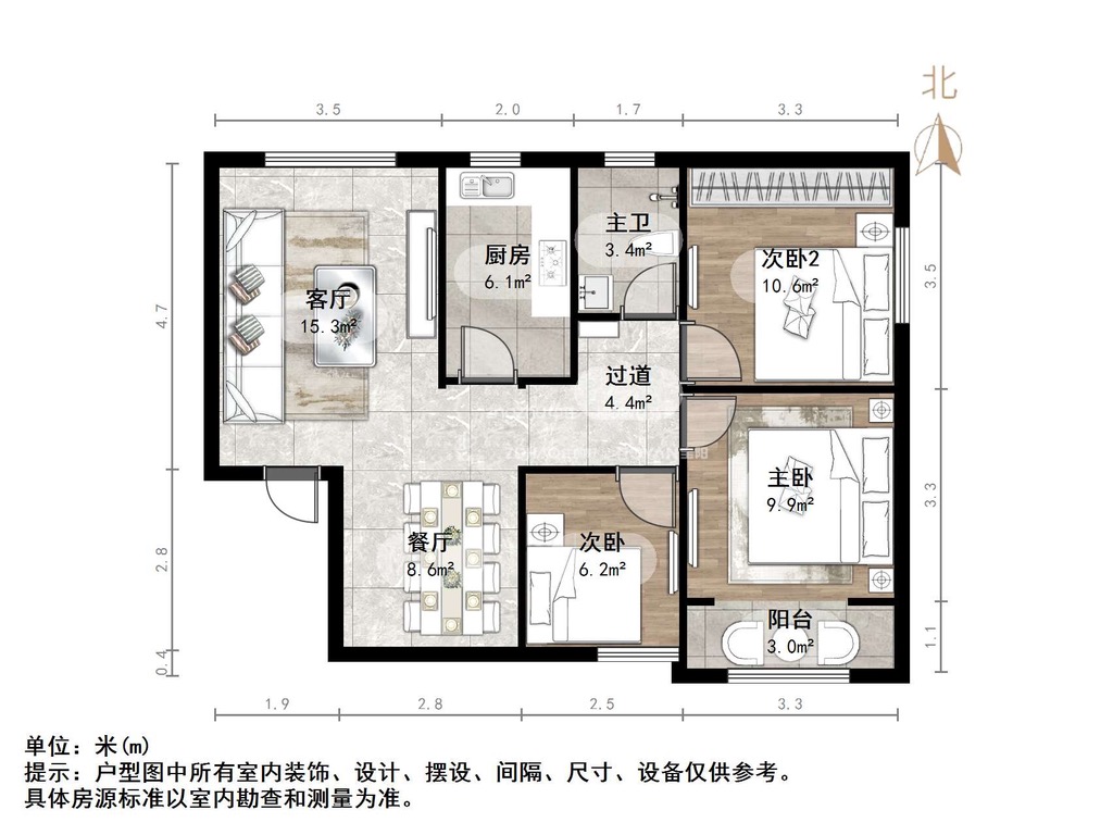 厅室3室2厅1卫1阳台