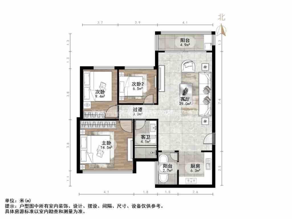 厅室3室2厅1卫1阳台