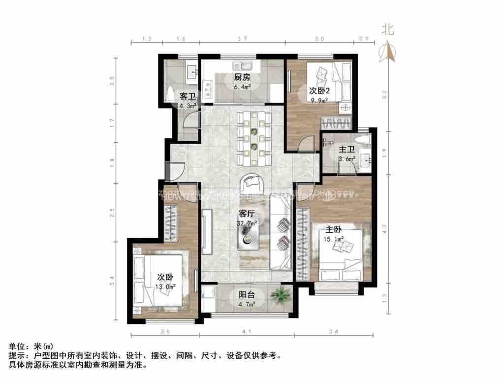 厅室3室2厅2卫1阳台
