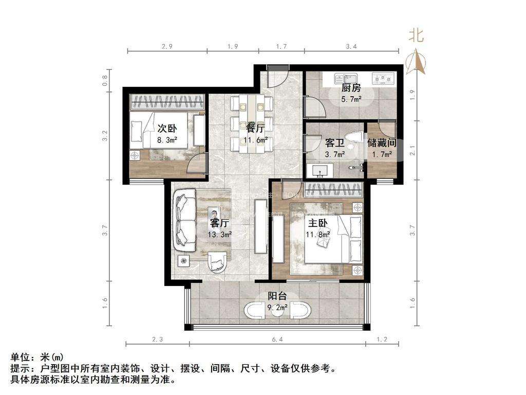 朝向南北 建筑面积93.6㎡