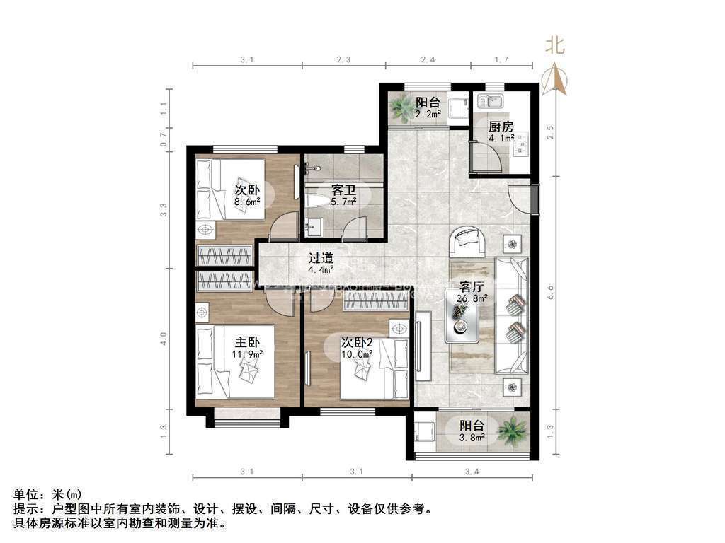厅室3室2厅1卫1阳台