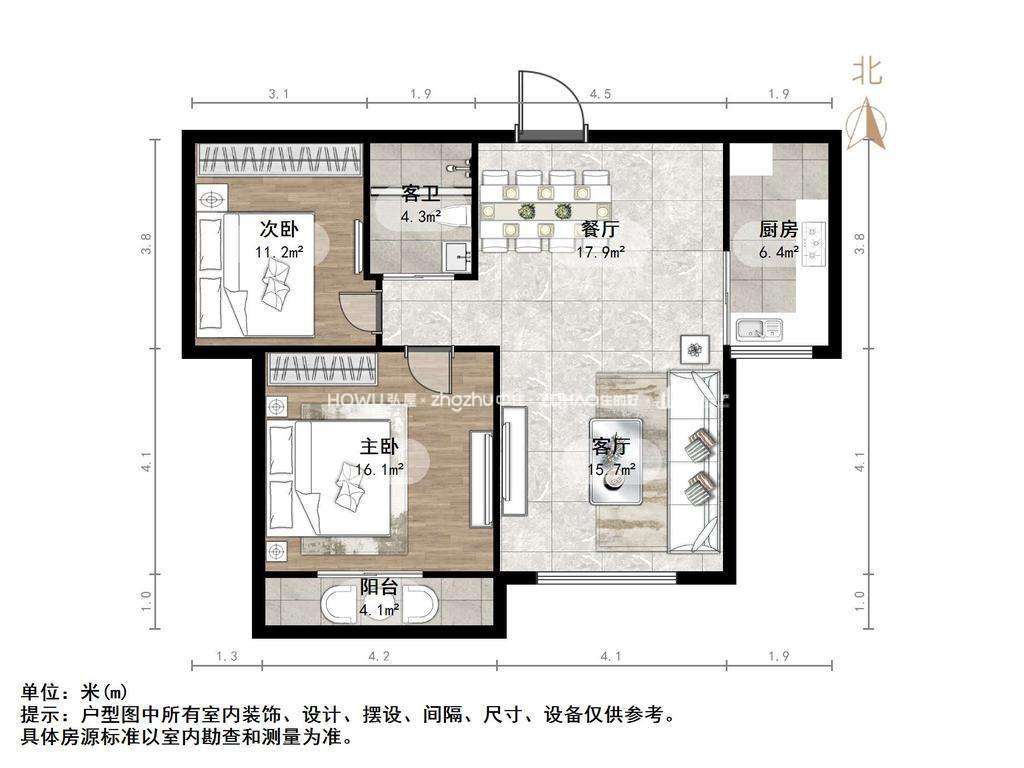 厅室2室1厅1卫1阳台