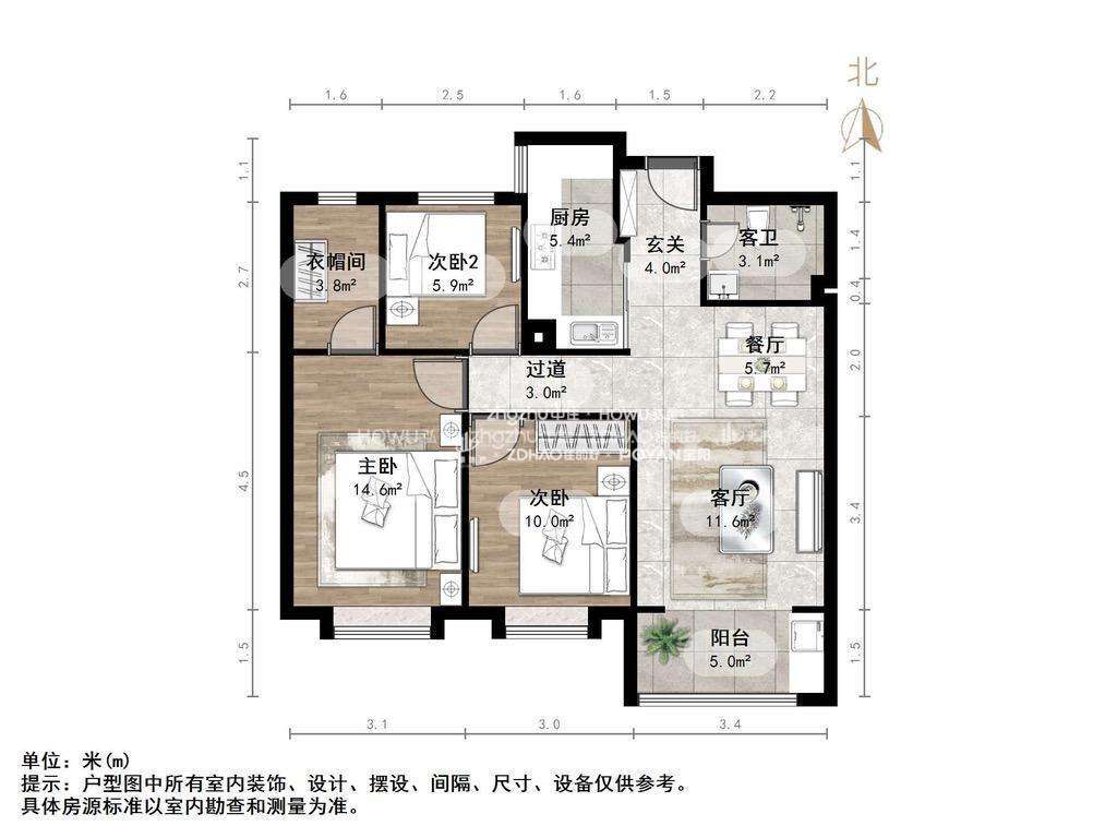 厅室3室2厅2卫1阳台