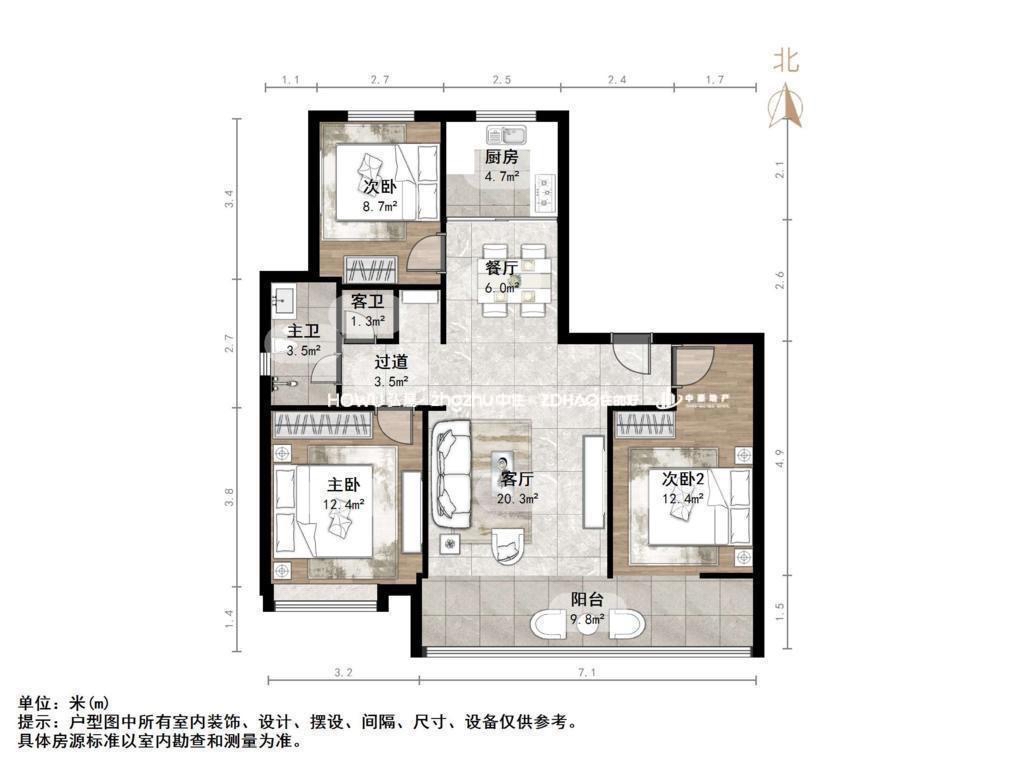 厅室3室2厅2卫1阳台