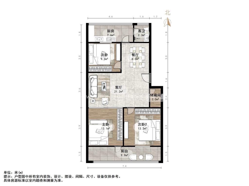 厅室3室1厅1卫2阳台