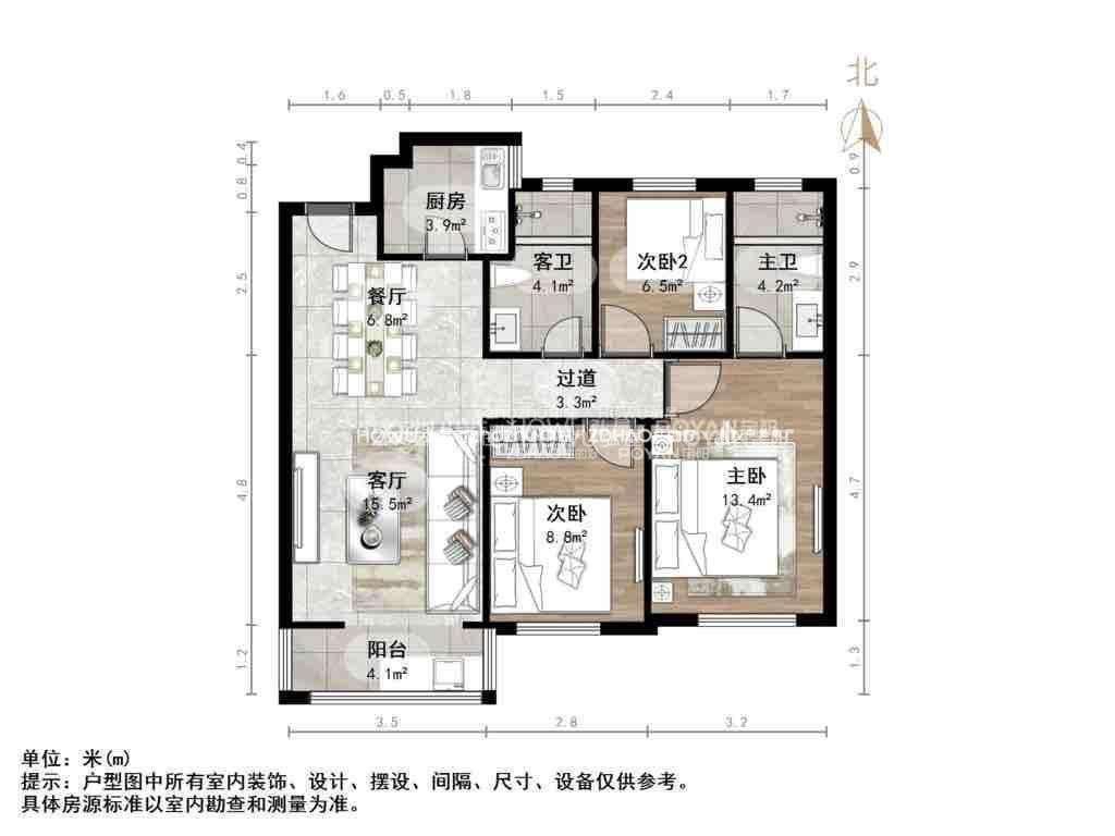 厅室3室2厅2卫1阳台