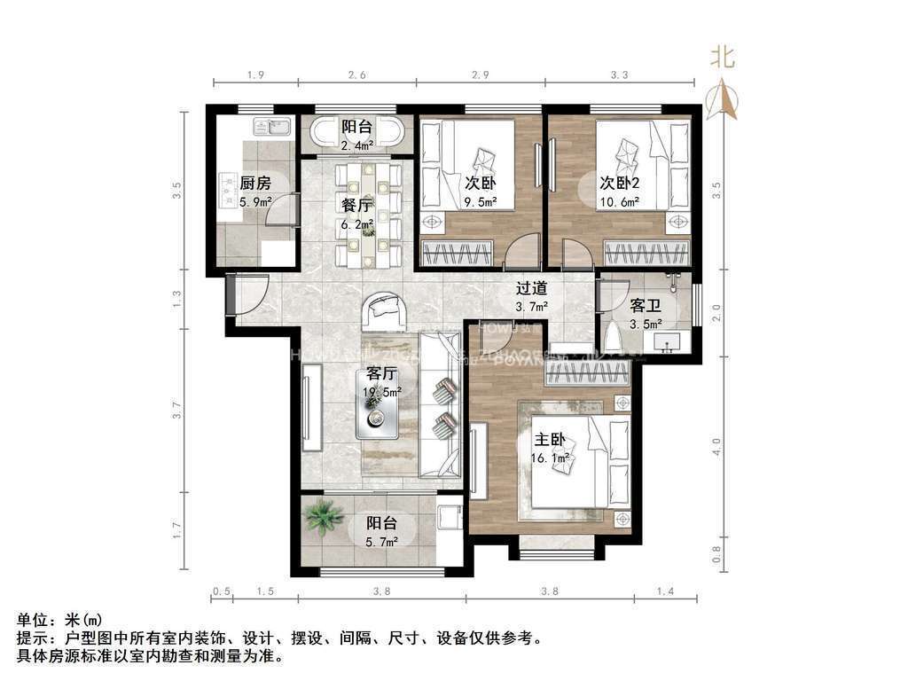 厅室3室2厅1卫1阳台