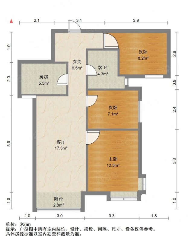 厅室3室2厅1卫1阳台