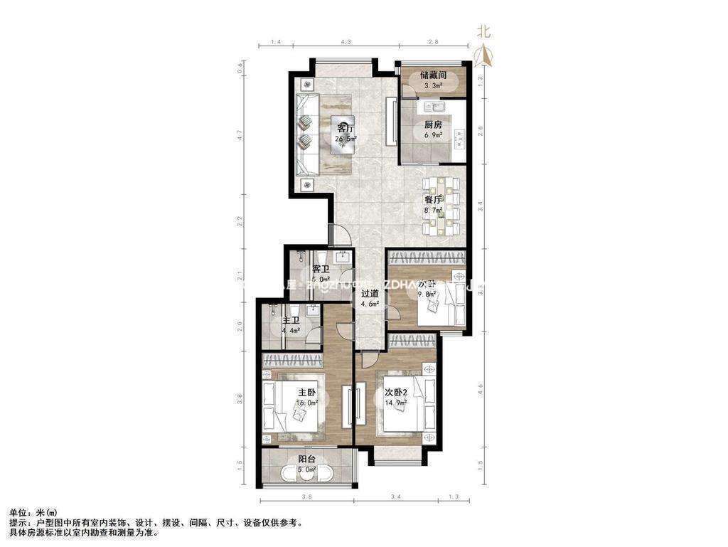 厅室3室2厅2卫1阳台