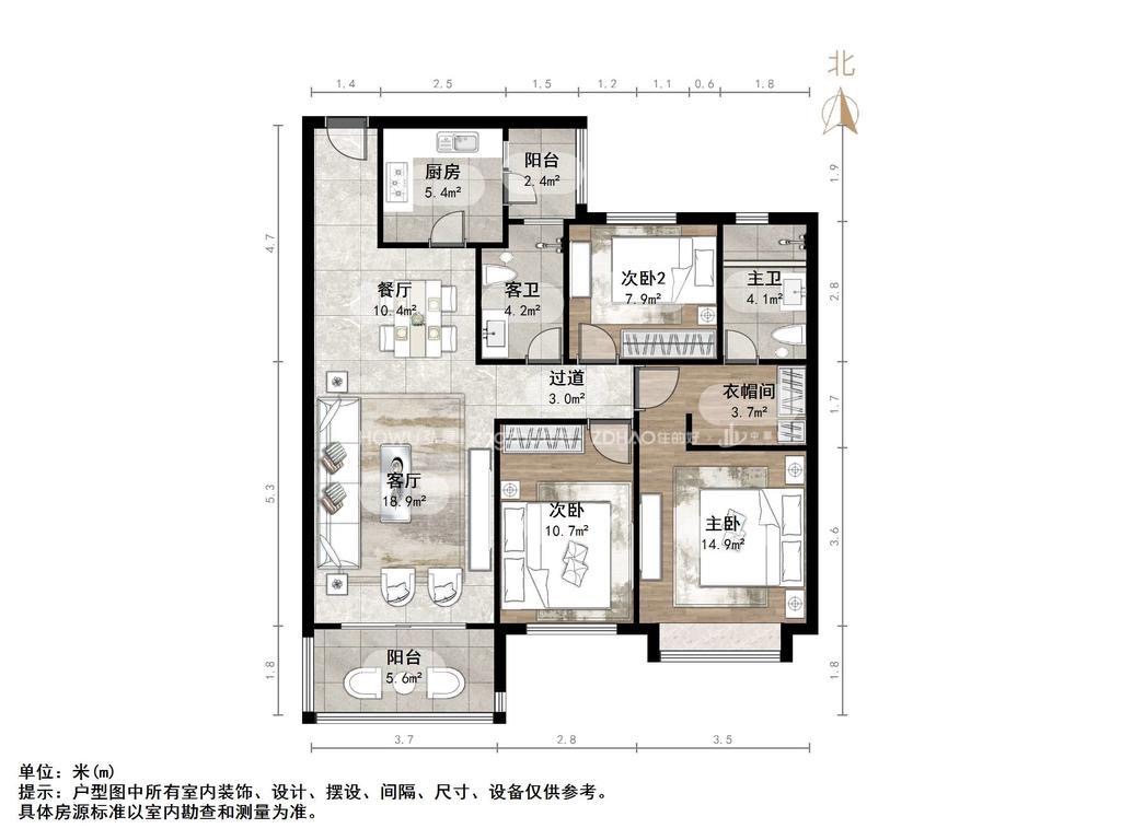 厅室3室2厅2卫1阳台
