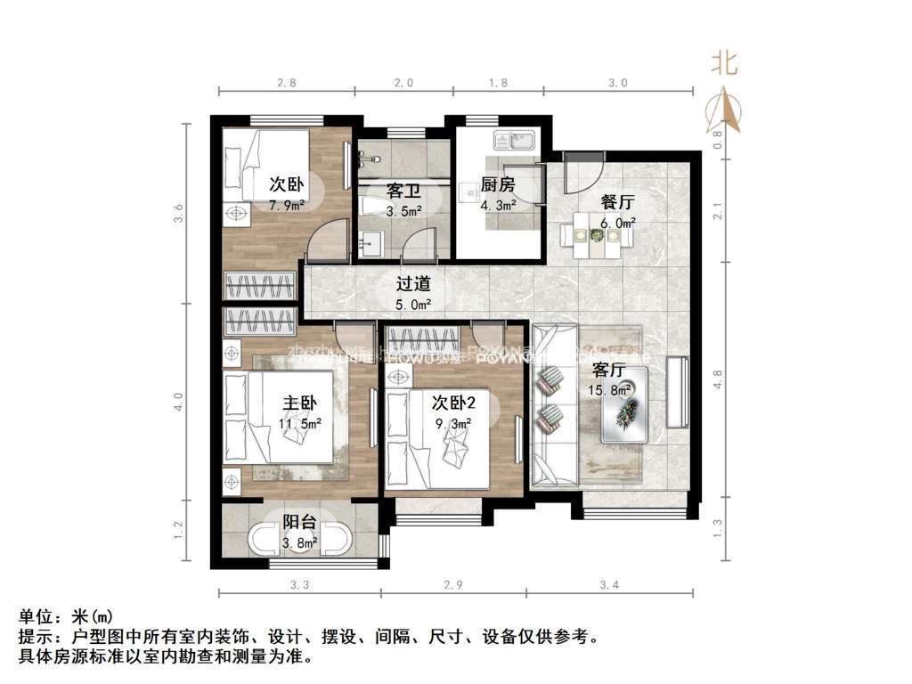 厅室3室2厅1卫1阳台