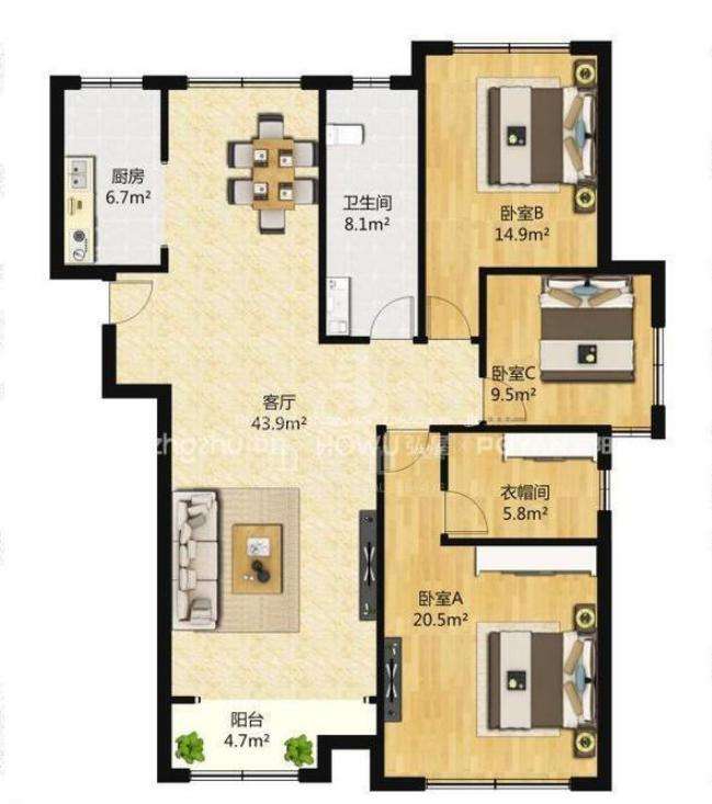 厅室3室2厅2卫1阳台