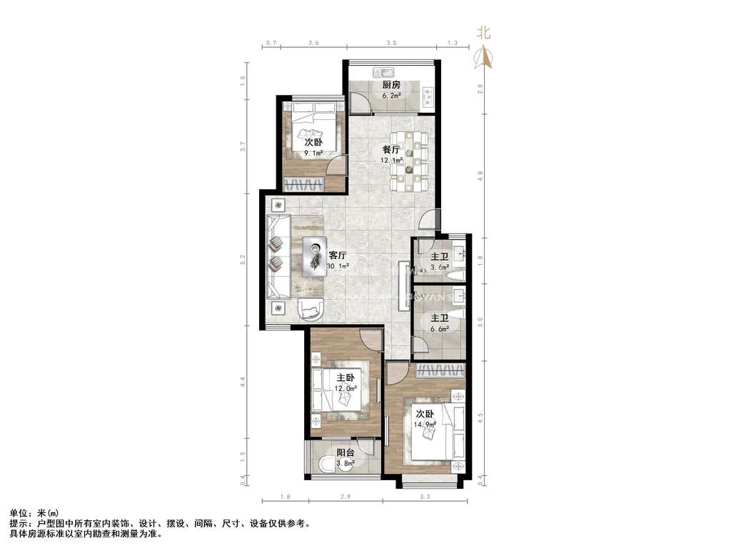 厅室3室1厅1卫1阳台