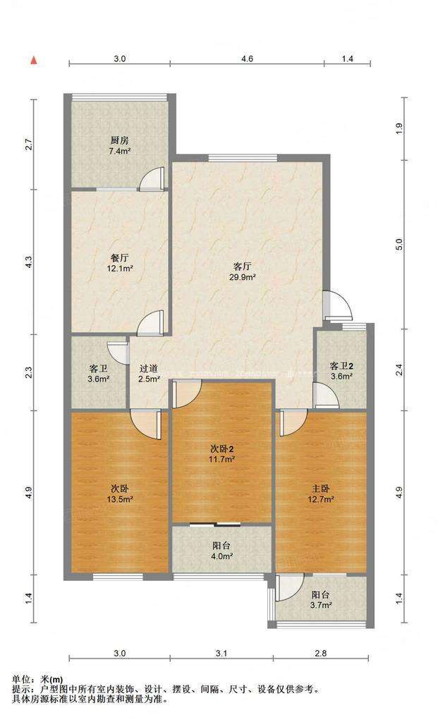 厅室3室2厅2卫1阳台