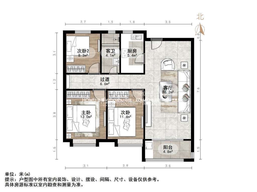 厅室3室2厅1卫1阳台