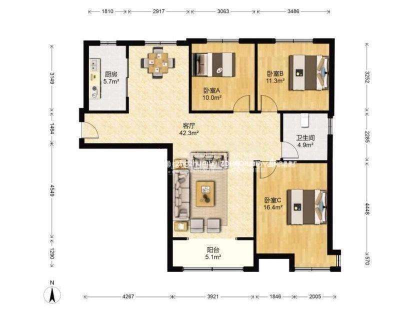 厅室3室2厅1卫1阳台