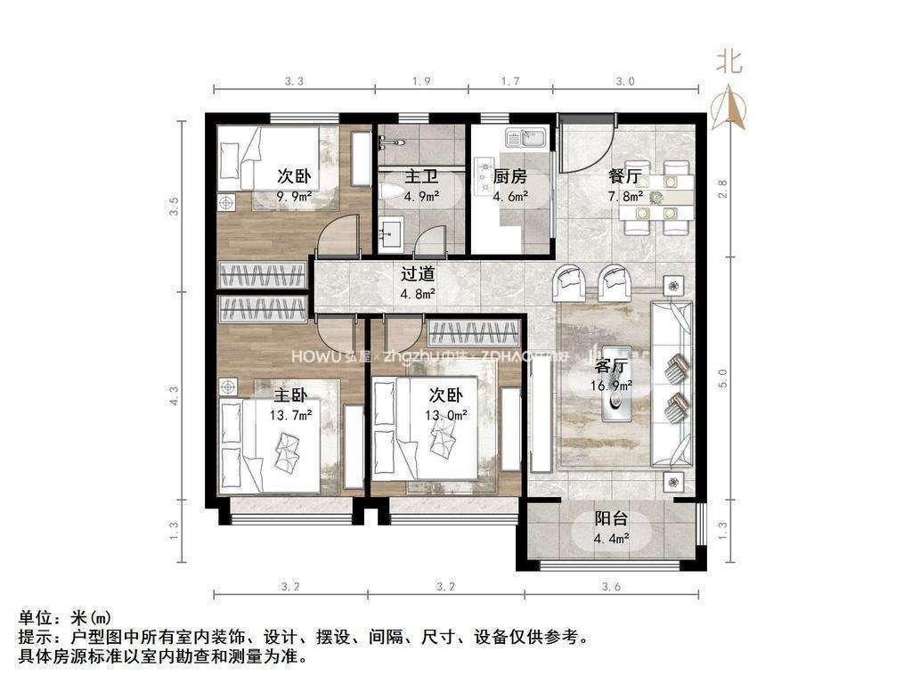 厅室3室2厅2卫1阳台