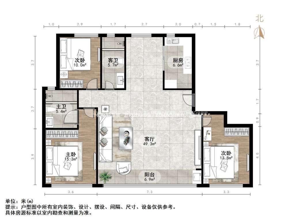 厅室3室2厅2卫1阳台