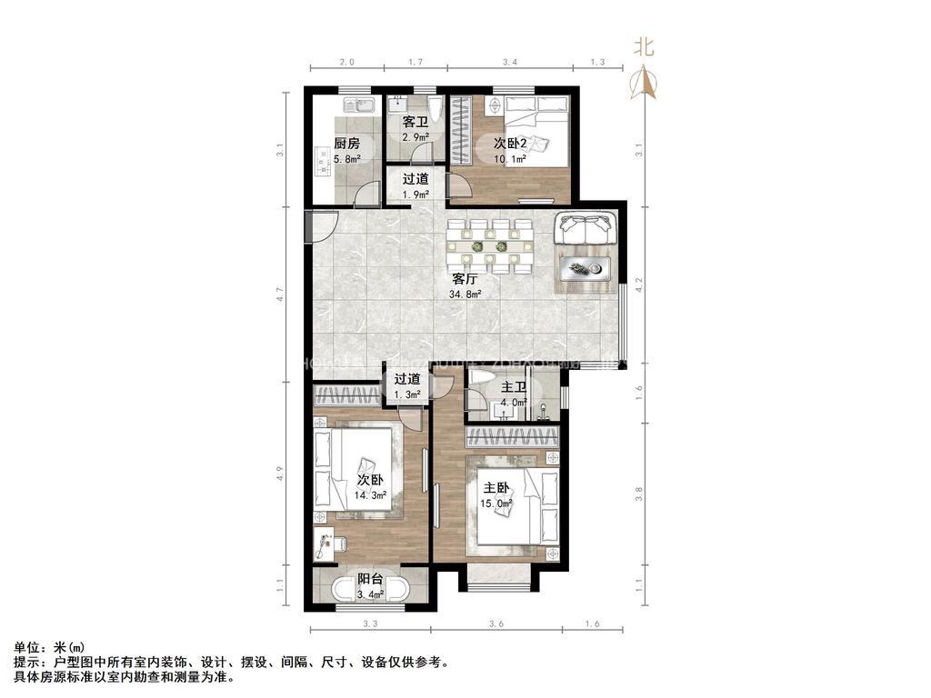 厅室3室2厅2卫1阳台