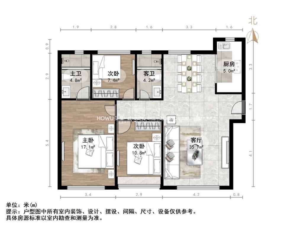 厅室3室2厅2卫1阳台