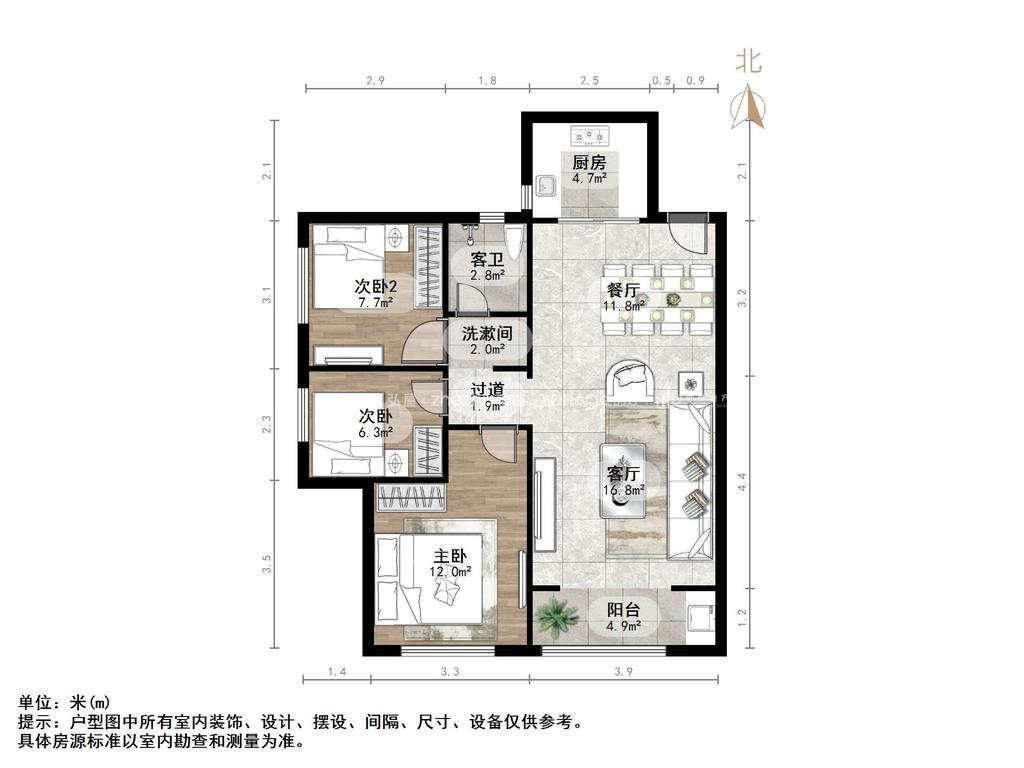 厅室3室1厅1卫1阳台